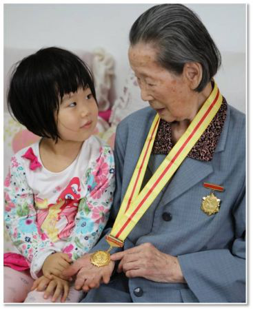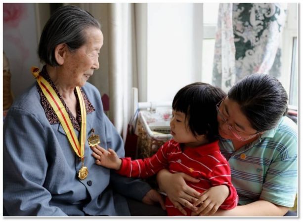 姨奶自己沒有孩子,但是非常疼愛我的女兒,每次孩子在上學(xué)前都要彼此招手再見才讓出門,女兒是她的好朋友。記得,2015年抗日戰(zhàn)爭勝利七十周年前夕,中央給每位老戰(zhàn)士送來抗戰(zhàn)勝利紀(jì)念章和5千塊錢慰問金,姨奶非常珍視,拿出其中的3千元交給妻子,囑咐說:“這是中央給我的錢,一定要作為孩子入學(xué)第一年的學(xué)費”。比較欣慰的是,孩子從小乖巧,雖然還會和老奶奶爭著看動畫片、搶遙控器,但是即使再喜歡的東西,都會主動與老奶奶分享。一次我們回老家,回來時已經(jīng)挺晚了,老人已經(jīng)進了自己的房間,那年孩子應(yīng)該是不到四歲,大人們都在忙活著歸置整理東西,小朋友自己打開盒子拿了一串葡萄送到了老奶奶的房間,老奶奶從房間里出來的那一刻,我看到了她激動的眼含淚光。