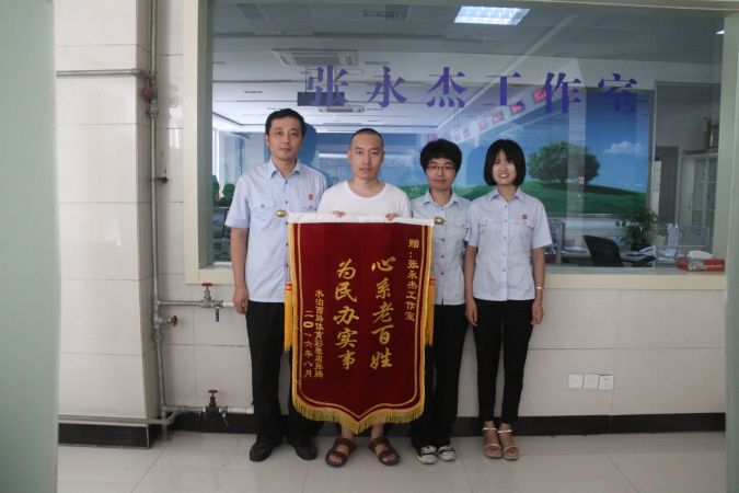 找了兩個(gè)人拿著一面錦旗站在工作室外,堅(jiān)決要求張永杰收下,張永杰在征得領(lǐng)導(dǎo)意見(jiàn)后,接受了這面寫(xiě)著“司法效率解民憂”的錦旗。